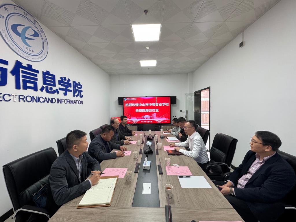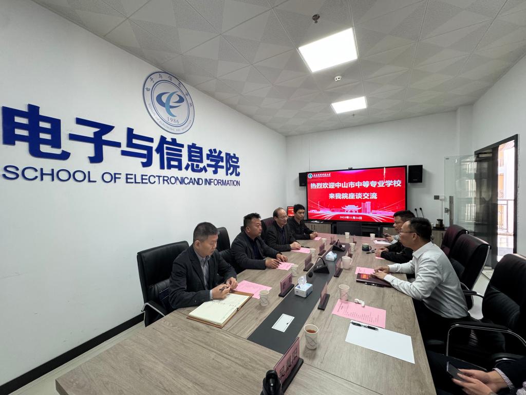 11月26日,中山市中等专业学校(以下简称中山中专)党委副书记、校长刘尚楠,党委委员、副校长鲁东晴,信息技术部主任舒荣,骨干教师刘开云一行4人前来白云校区开展调研交流。电子与信息学院党委书记罗旭辉,院长单纯,副院长林沛,电子工程系主任赖森锋,党政办公室主任吴晨阳参加座谈会,双方围绕深化“3+4”中本贯通人才培养模式、加强校际合作、共育高素质技术技能人才等议题进行了深入座谈与交流。