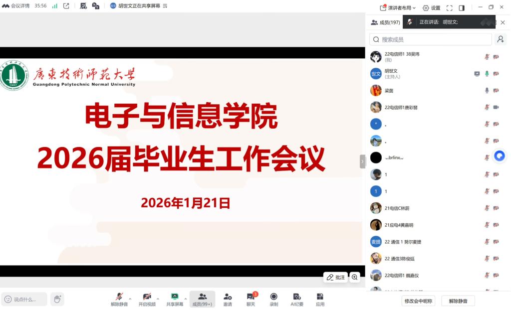 1月21日,电子与信息学院以线上会议形式召开2026届全体毕业生工作会议。学院党委副书记梁茵、教学副院长林沛以及相关负责老师参加会议。