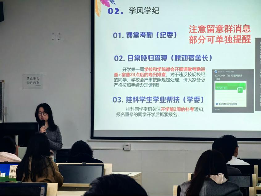 一是强化学风建设,筑牢学习根基。学风建设方面,学院先后召开学风建设推进会、学院纪律委员例会,明确新学期学风培育目标,细化学风监督举措,完善学风预警与家校协同机制,推动形成比学赶超的良好氛围。针对开学补考学生的实际需求,学院专项举办补考备考指导分享会,邀请专业教师梳理核心知识点、分享高效备考技巧,解答学生备考困惑,助力学子查漏补缺、顺利通过补考,快速调整学习状态投入新学期。