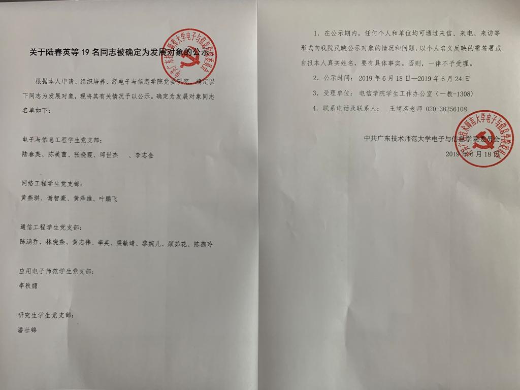 根据本人申请、组织培养、经电子与信息学院党委研究,确定以上同志为发展对象,现将其有关情况予以公示。1.在公示期内,任何个人和单位均可通过来信、来电、来访等形式向我院反映公示对象的情况和问题,以个人名义反映的需签署或自报本人真实姓名,要有具体事实。否则,一律不予受理。2.公示时间: 2019年6月18日—2019年6月24日3.受理单位: 电信学院学生工作办公室(一教-1308)4.联系电话及联系人: 王靖茗老师 020-38256108