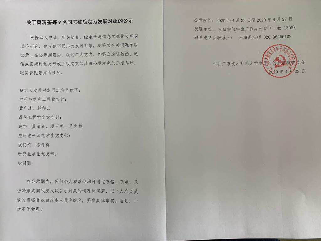 关于莫清荃等9名同志被确定为发展对象的公示